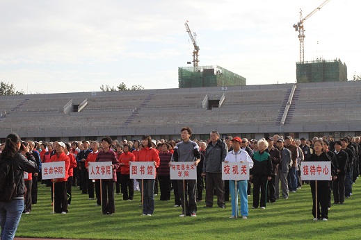 2011年10月15日上午,122cc太阳成集团离退休教职工“颂党恩 和谐促发展,抒豪情 贡献新百年”主题实践活动之一——趣味运动会,在学校东大操场隆重开幕。
